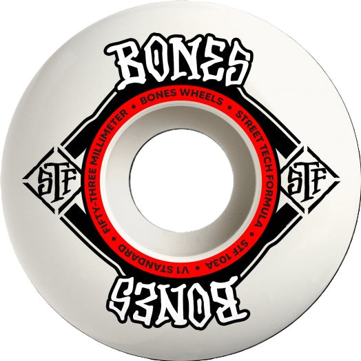 Set of four Bones STF V1 Standard White Skateboard Wheels in 53mm103a. Bones Street Tech Formula powers the legendary Bones STF wheels that roll fast, grip when you need to and slide when you want to, without flat spotting.