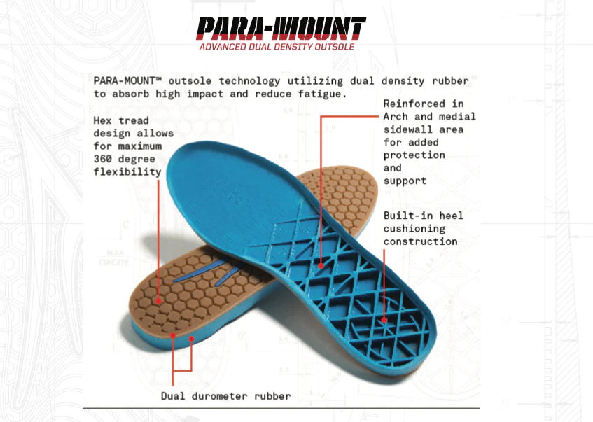 Our advanced PARA-MOUNT™ outsole technology utilizes dual density cushioning to absorb high impact. The Hex-tread design combines 360 degree flexibility for increased board feel and maximum grip. Reinforced in the arch area for added protection and support.