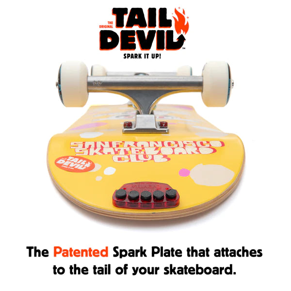 Le Tail Devil in Red est une plaque d'allumage qui se fixe à la queue de votre skateboard. Fixez simplement à la queue du pont avec le ruban adhésif et/ou les vis fournis. Prenez de la vitesse, faites un wheelie, faites glisser votre Tail Devil et regardez les étincelles voler.