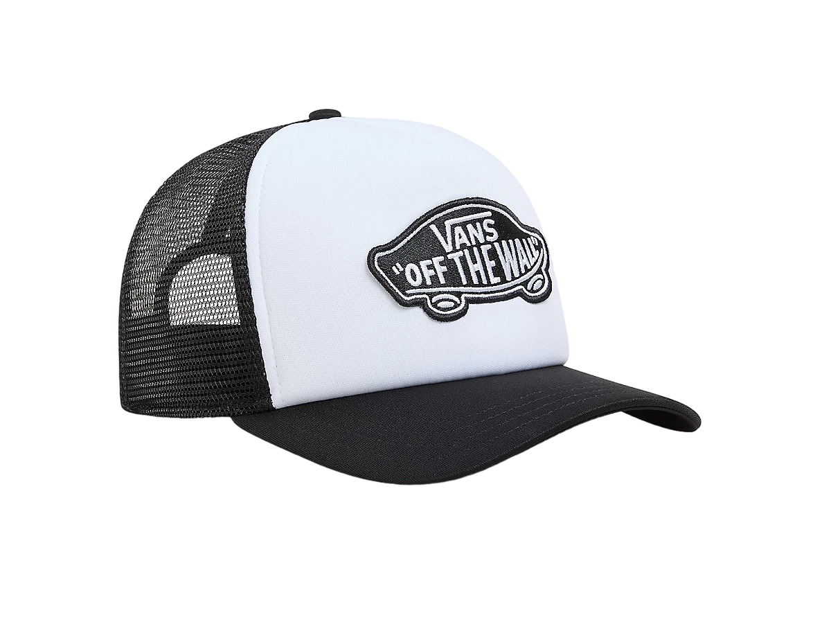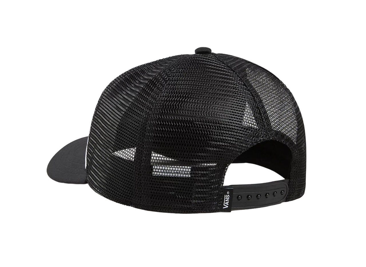 The Vans Classic Patch Curved Bill Trucker Hat in Black has 5 panel, a mesh back and the Vans Off the Wall logo on the front. It has an adjustable back.