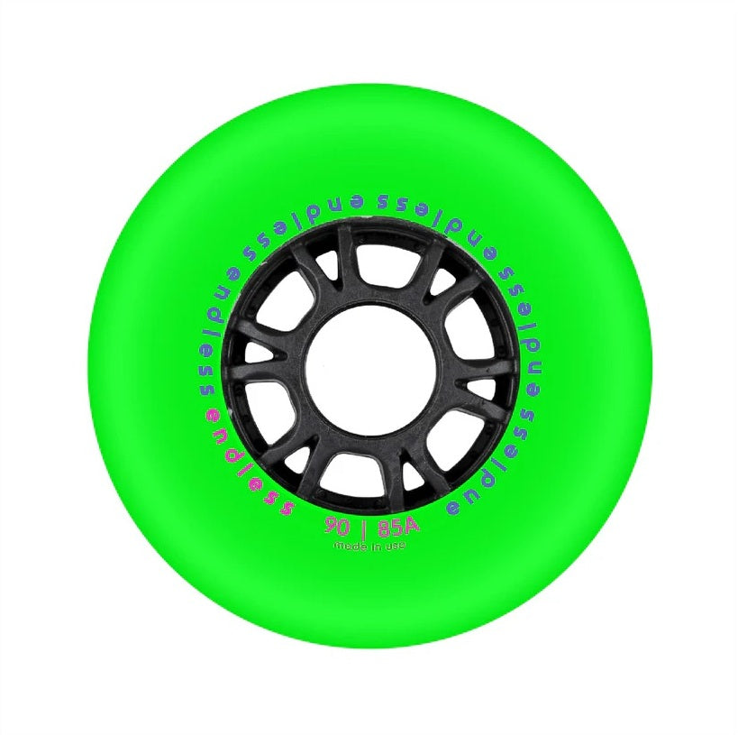 These are the Endless Neon Green 90mm Wheels in a set of 4. Endless believe the best skating experience is only realized when you have the best wheels on your skates. These premium Endless Blading wheels are made with the same excellent made-in-USA urethane formula and high performance core skaters have used and loved for years. Endless Blading wheels deliver an enhanced experience that balances speed, wear, grip, and sliding performance.