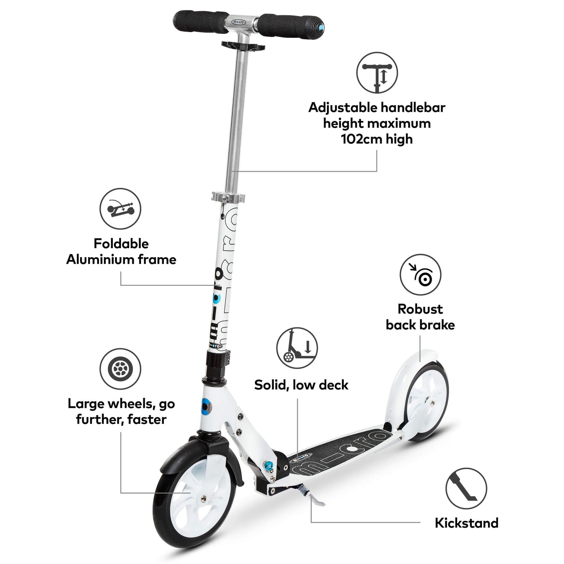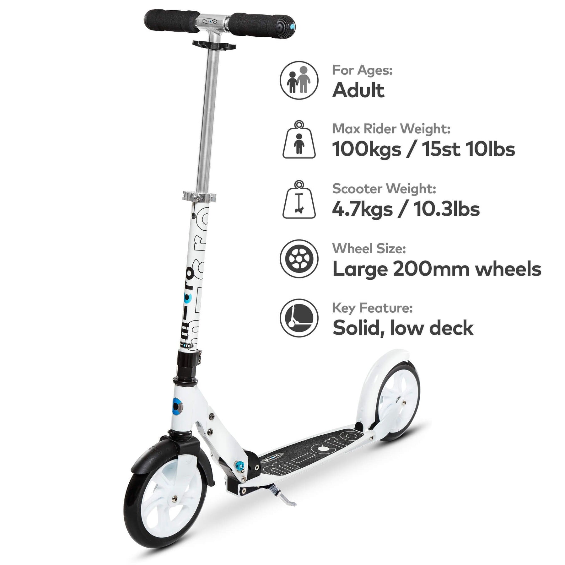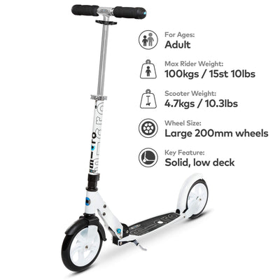 The Micro Classic in White has introduced millions of adults to the world of scooting. Micro's original two-wheeler is built for speed, designed for convenience. Loved for its low effort aluminium deck that provides extra stability, and its large 200mm wheels that deliver optimal transfer of energy into pace over the ground. The unique deck is wide and long - giving extra room for larger feet and making it easier to swap feet during long journeys - so going far is a breeze.