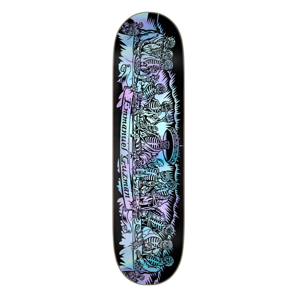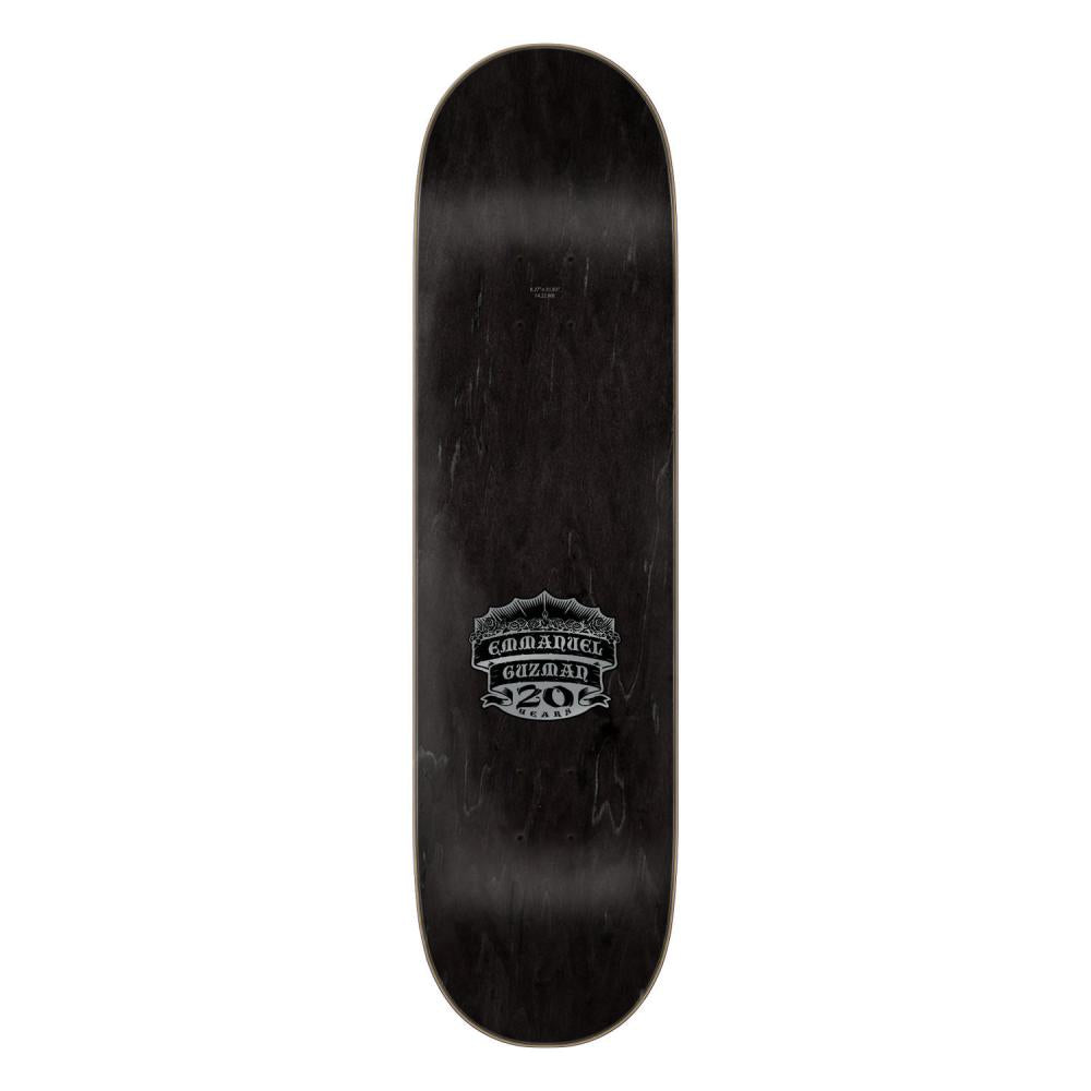 Santa Cruz Emmanuel Guzman Pro 20 Years Dining with the Dead deck featuring spot matte and prismatic foil graphics with black and purple stained veneers and 20 Years top graphic.