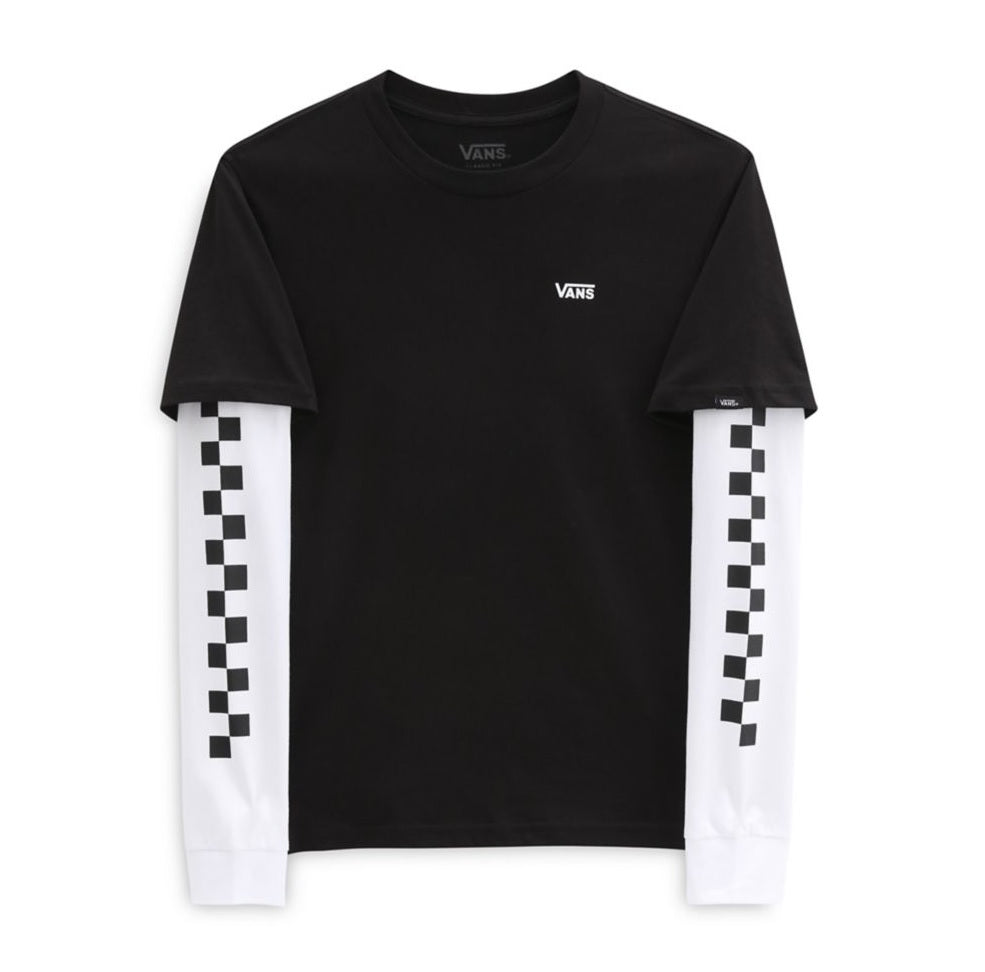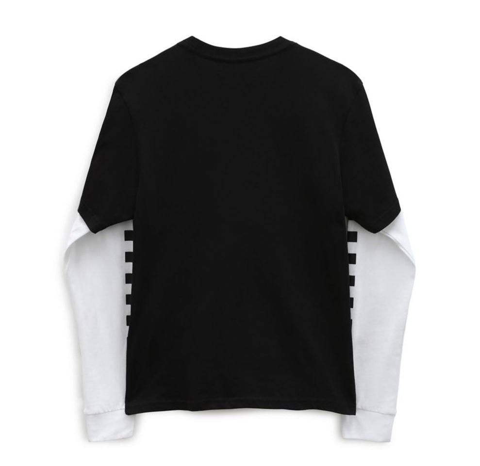 The Vans Boys Long Check Twofer T-Shirt in Black is a 100% combed ringspun cotton two-in-one t-shirt with checkerboard graphics at the sleeves and logo graphics at the chest.