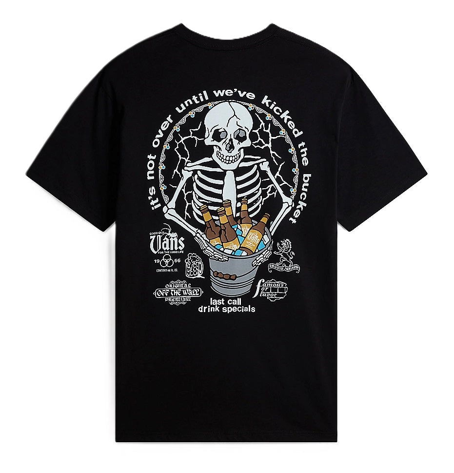 The Bucket List T-Shirt is a short sleeve crewneck T-shirt made from a heavier weight cotton, featuring the Vans® logo on the front and a partying skeleton graphic on the back.