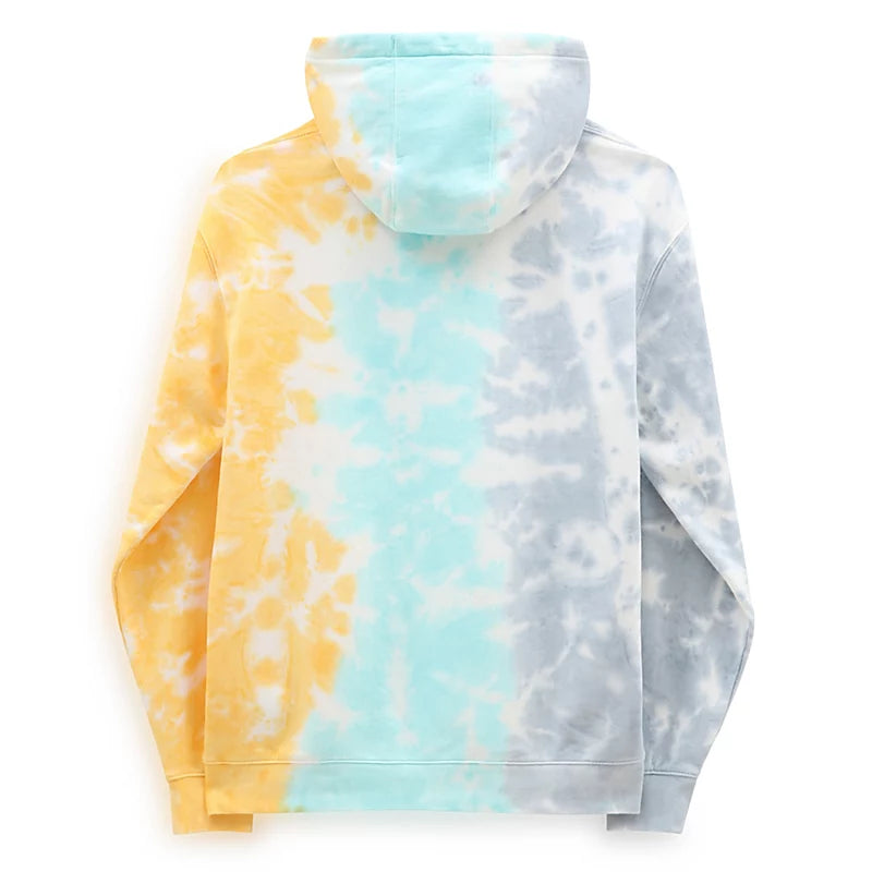 An allover tie-dyed print splashes across the Happy Thoughts Tie Dye Pullover, a hooded sweatshirt made with 80% cotton and 20% polyester fleece. Printed logo graphics at center chest and a classic front pouch pocket round out the vibrant aesthetic.