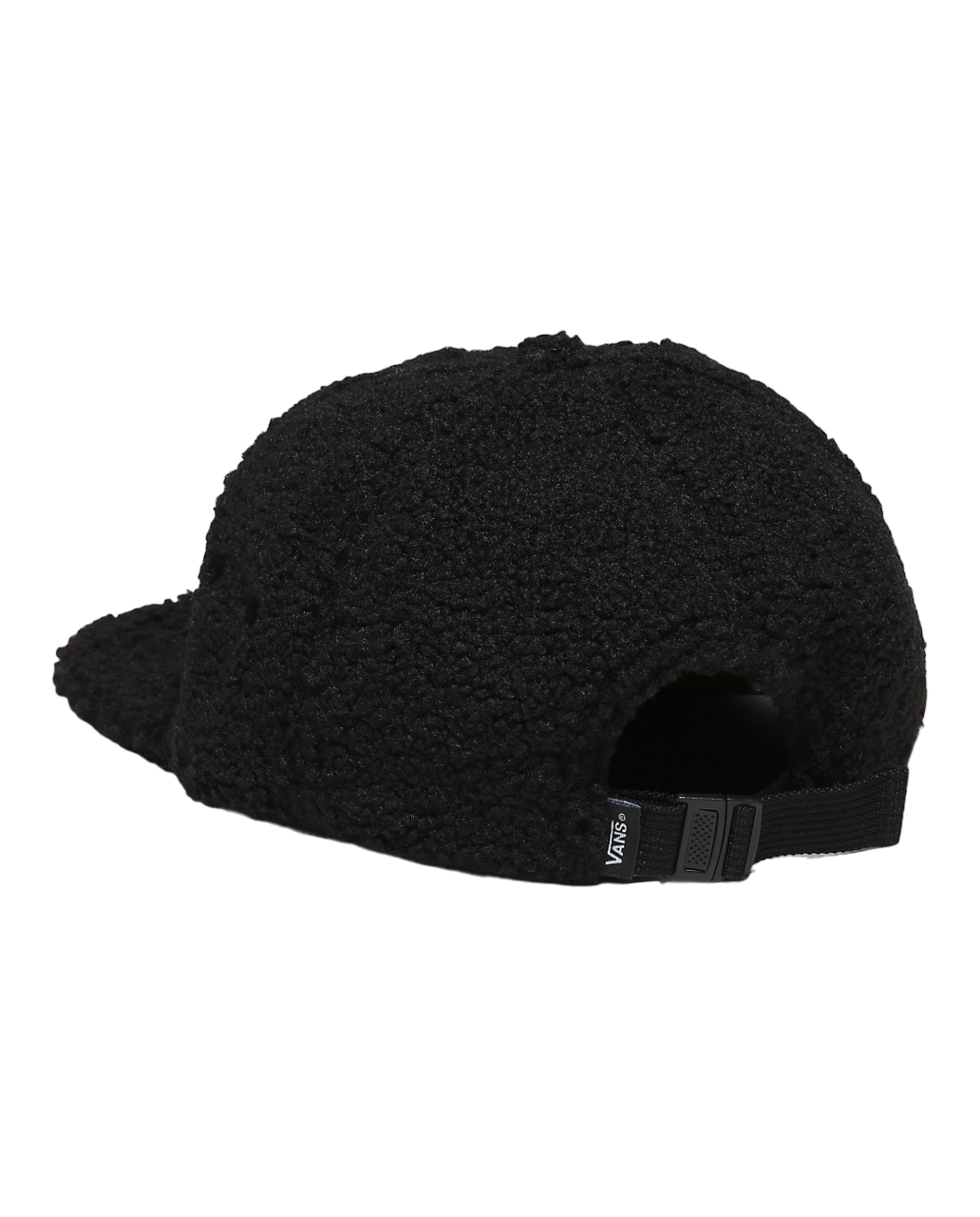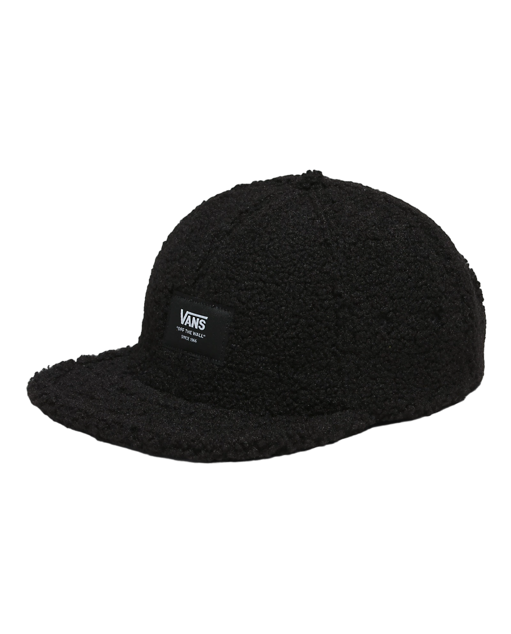The Vans OTW Jockey Cap in Black is a five-panel snapback hat. It features the Vans Off the Wall logo on the front panel, and the Vans flag label on the adjustable back strap.