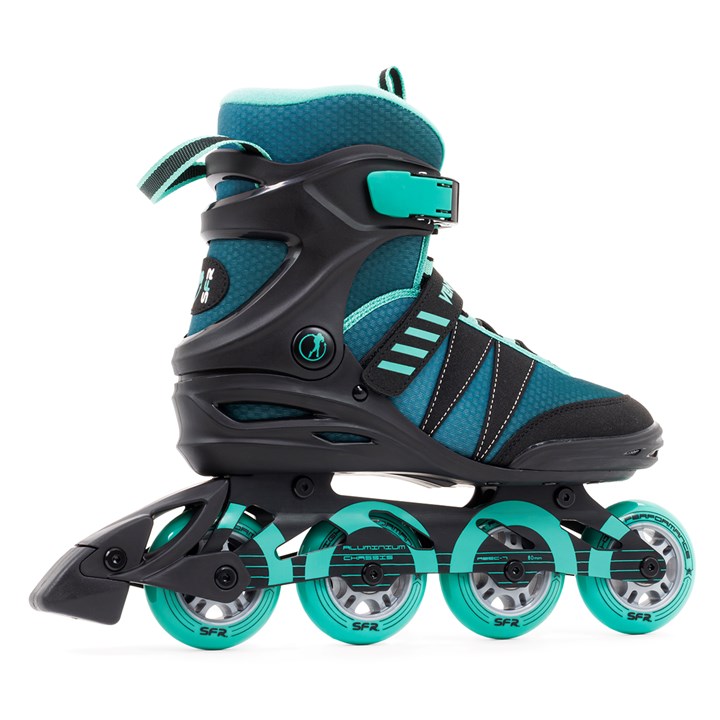 The SFR Venture Pro in Teal is designed with a comfortable, wide-fitting liner and insoles that promote a neutral foot position, helping to avoid cramped toes. Its unisex design provides a flexible fit for various users. The skate features a robust PP cuff and shell construction, a toe protector, and a reliable high-quality buckle combined with a 45-degree hook and loop power strap. The two-piece aluminum frame supports high-rebound urethane wheels, available in 80mm for sizes 3J-7A and 84mm for sizes 8A-11A. It is equipped with ABEC-7 bearings and a TPR brake on the right foot. The maximum rider weight is 100kg.