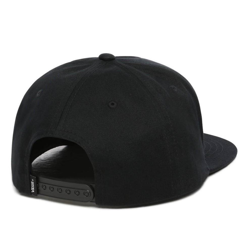 The Classic Patch Snapback in Black is a 100% cotton 5-panel snapback hat with a Vans Off The Wall logo patch at the front panel.