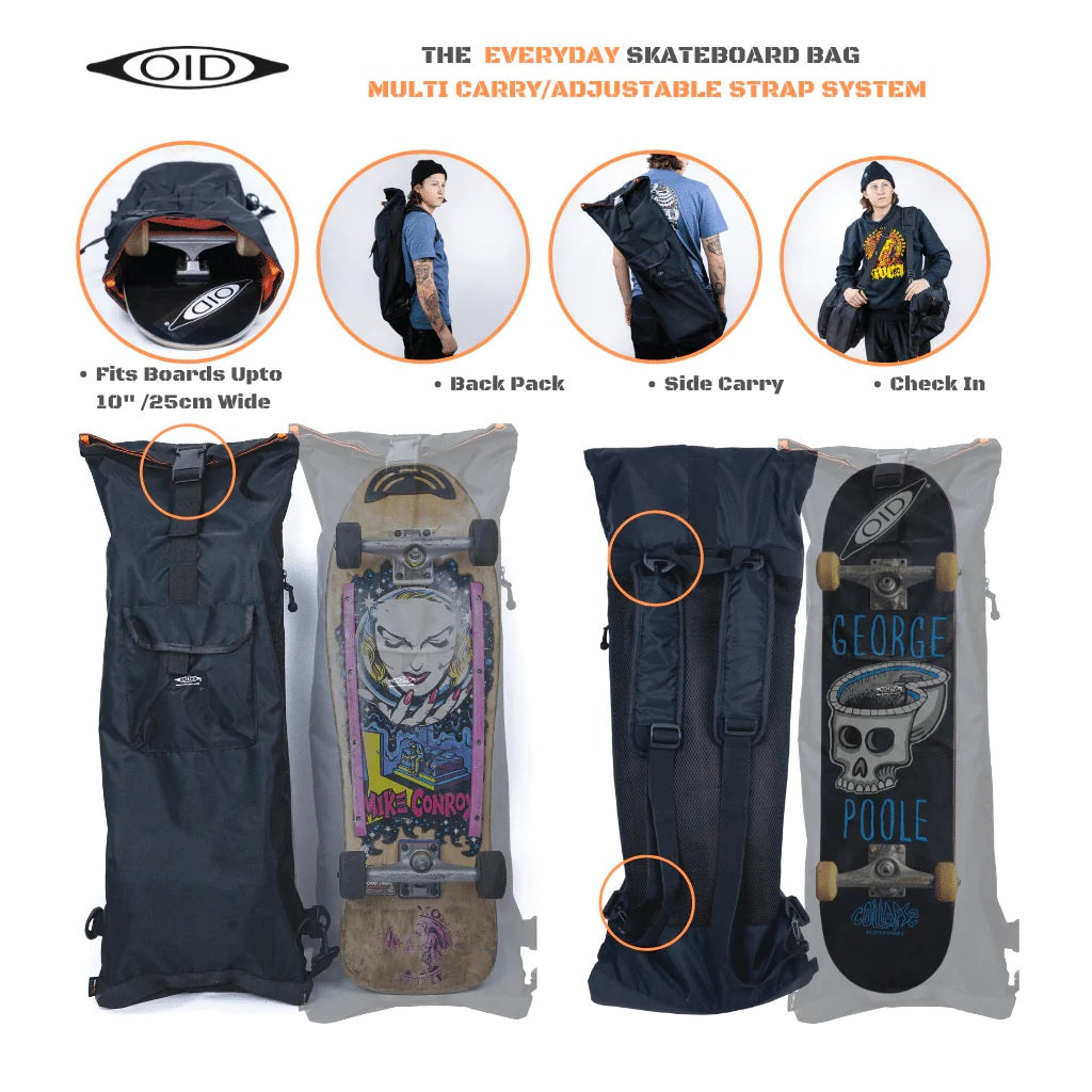 Intelligently designed to comfortably transport a complete skateboard, spare decks, helmet and all accessories.