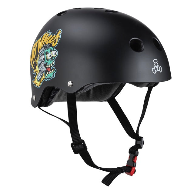 This is the Triple 8 Sweatsaver Helmet Hot Wheels Special Edition, featuring a custom Hot Wheels™ graphic on the side, a special collaboration logo on the back and a printed liner to tie it all together. The sweatsaver is the first and only helmet to integrate high impact absorbing EPS Foam with thick dual density soft foam and Sweatsaver fabric. This makes it one of the most comfortable helmets you can use as it works to get rid of sweat as you skate.