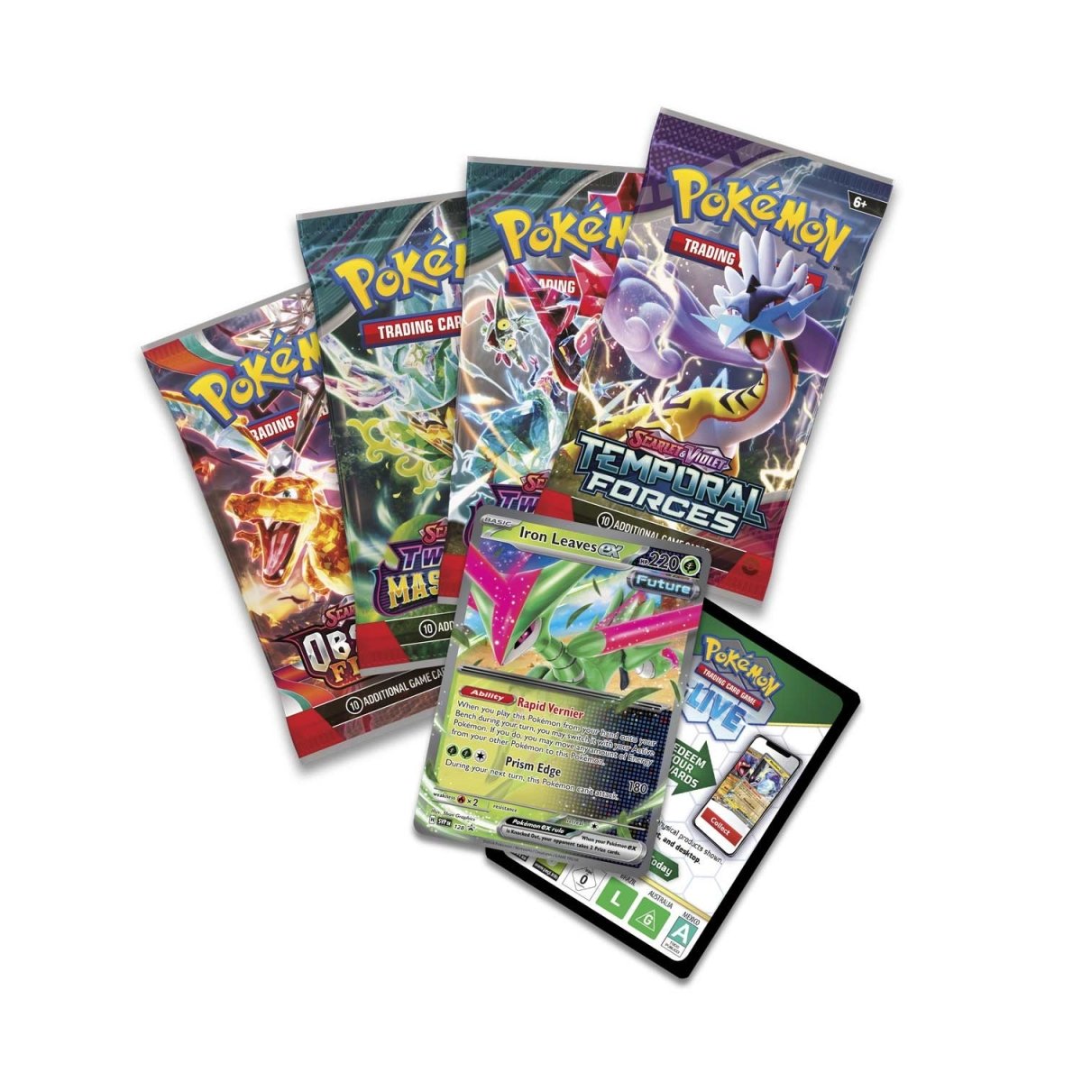 Powerful Paradox Pokémon arrive from the past and future to test their might as Pokémon ex! Iron Leaves ex is ready to devastate opponents with its powerful Prism Edge attack, and you’ll find additional helpful Pokémon and Trainer cards inside a handful of Pokémon TCG booster packs.